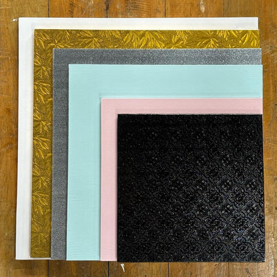 A huge range of cake boards from thick to thin. Square, round, heart shape and rectangle. In a wide variety of patterns and colours.