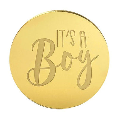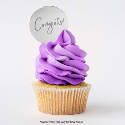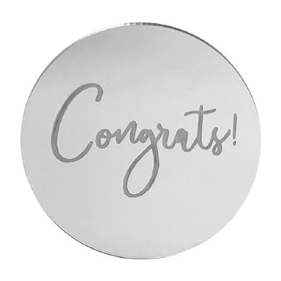 Round acrylic mirrored cake toppers with popular celebration sayings.