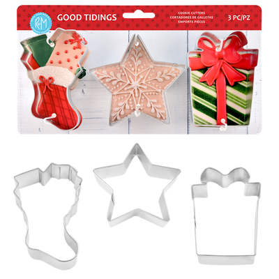 Christmas cookie cutter set 3 Good Tidings present stocking and star
