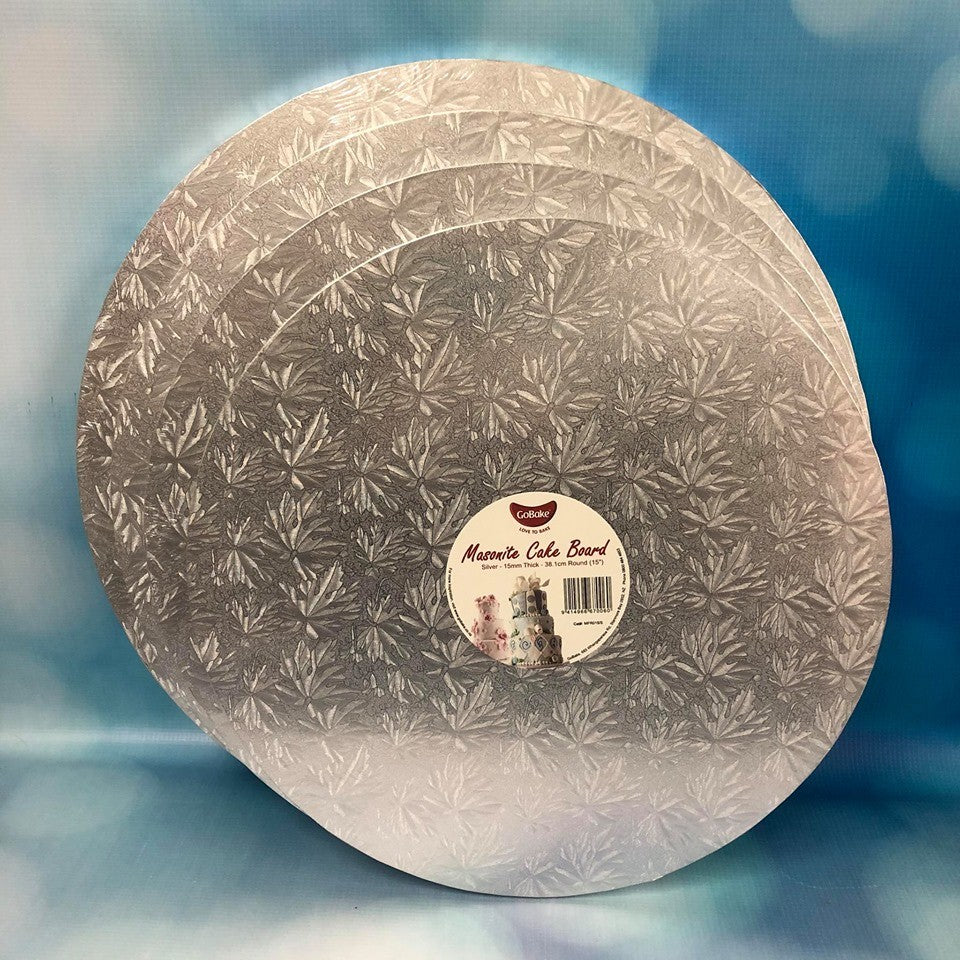 Thick 15mm Masonite cake board. With silver foil covering. Very strong for the heaviest of cakes.