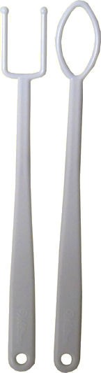 2 piece set includes a 2 prong fork for petit fours, cookies pretzels and more. Also an oval spoon for bon bons and round candy centers. 7 3/4" in length. The end to hold is flat and flared for easy control.