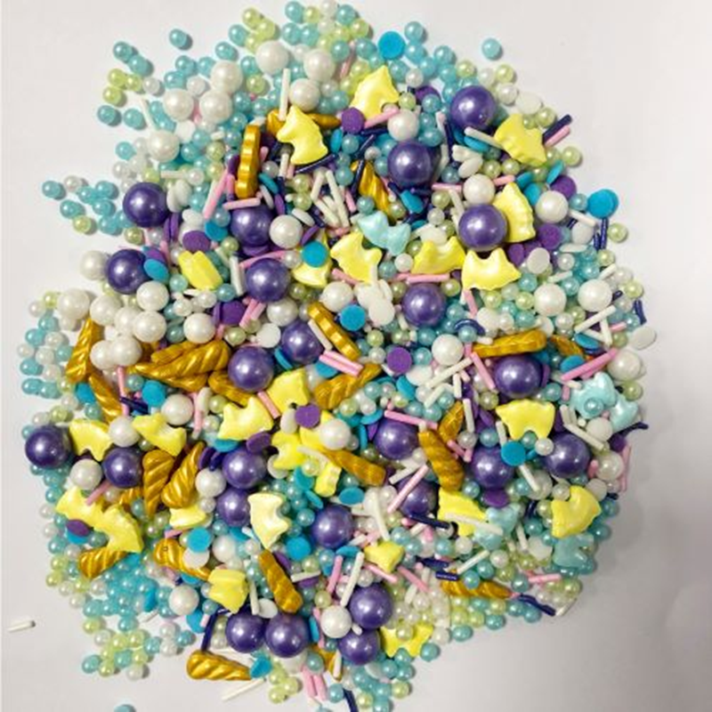Add a touch of magic to your treats with our Purple Unicorn Mix. Featuring gold unicorn horns, purple and white pearls, yellow unicorn heads, mini pearls, and jimmies, this mix is perfect for adding a whimsical touch to any cake. Made with high-quality ingredients, our mix adds a unique and colourful flair to your creations.