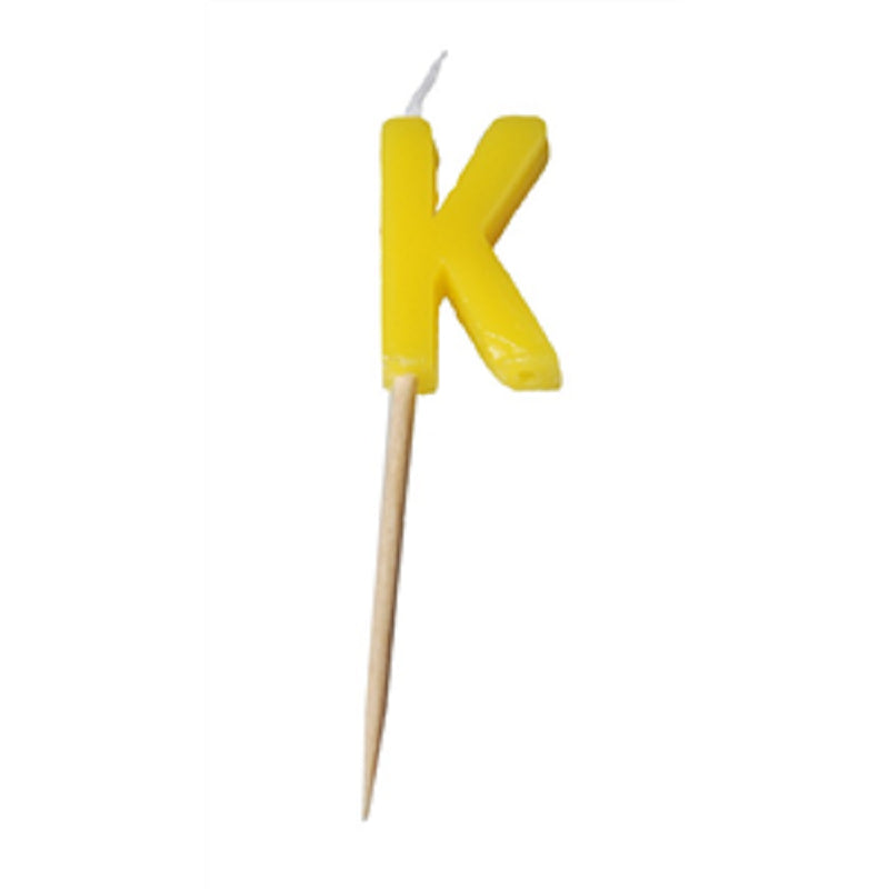 Alphabet or numeral candle on wooden pick Letter K Yellow