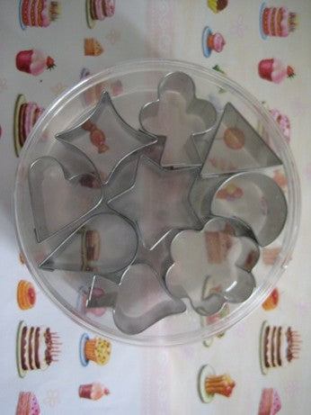 Chromed metal set of 9 cutters in 9cm clear storage container. shapes are heart, crescent moon, teardrop, star, spade, triangle club, diamond & flower. Great for cutting out fondant for cakes too.