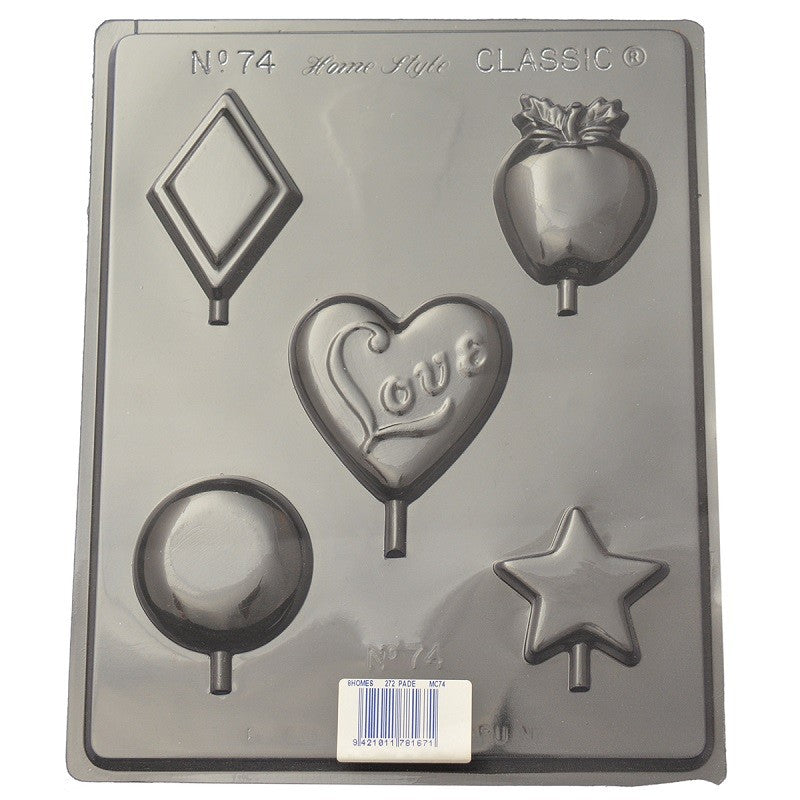 Great for the children to make. Use the lollipops chocolate mould for kids parties, on top of birthday cakes. Is suitable to be placed on sticks making chocolate lollipops. Has a diamond, apple, love heart, circle, star.