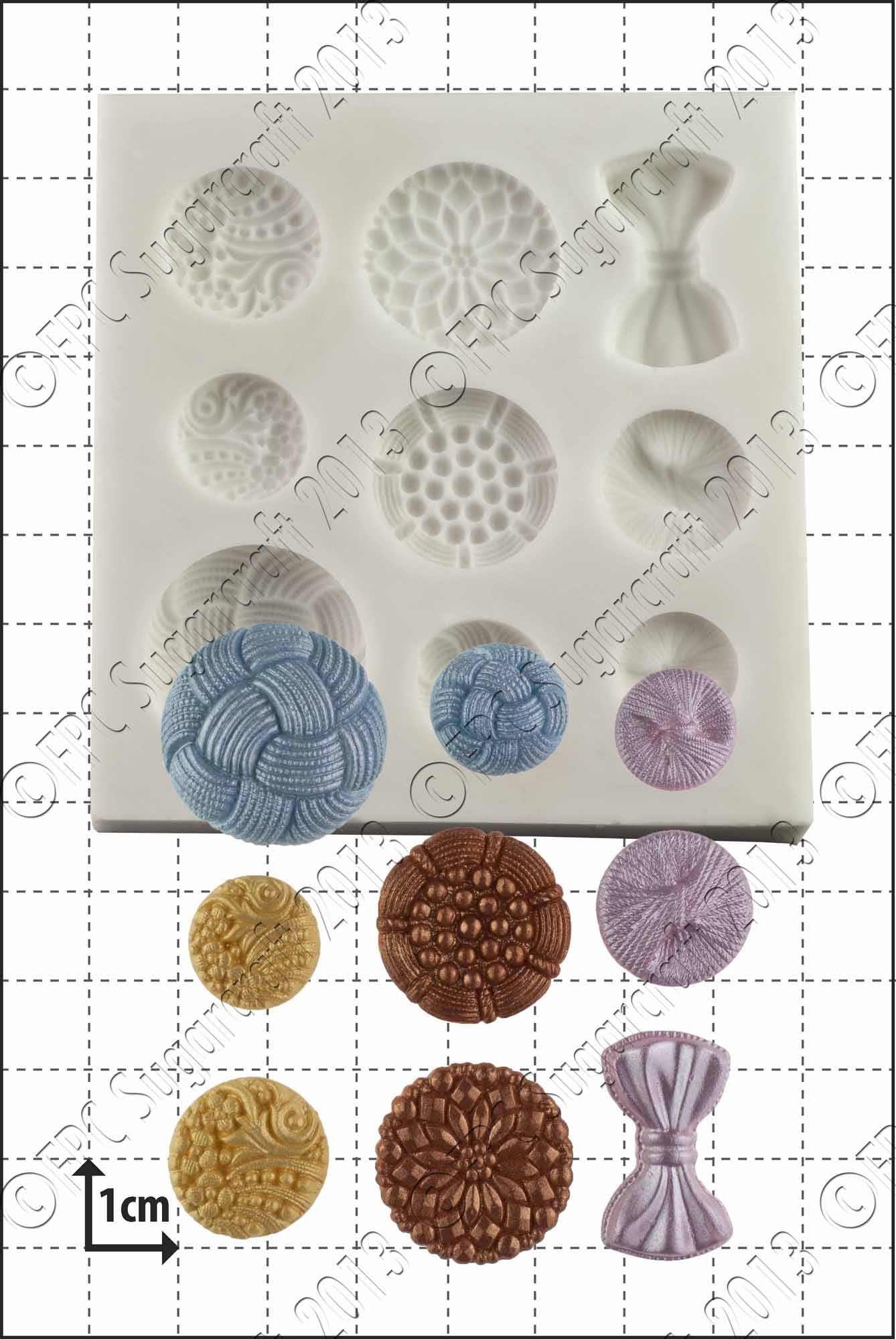 Largest button is 24mm. This gorgeous cake decorating mould, has great detail. It is designed and made in the United Kingdom. Kiwi Cakes is the sole New Zealand distributor. This silicone mould is suited for sugarcraft and moulding other foodstuffs such as chocolate, marzipan etc. The material used is soft and pliable and possesses inherently good release properties, making demoulding essentially trouble free. It can be used and re-used many times and washed with household detergent like any other kitchen implement. Of course you can equally well use it for moulding other craft materials such as Plaster of Paris, polyester, PU, wax and so on. The picture shows the mould itself, together with examples of what can be produced. The items are sugarpaste cake decorations coloured for effect. These are shown for illlustration only and are not included.