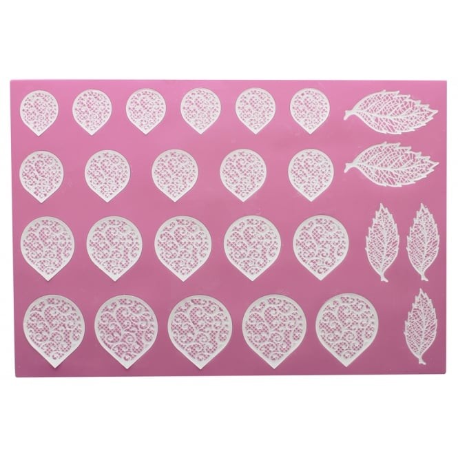 Claire has designed this additional flower mat with the aim for everybody, novice or expert to assemble Cake Lace flowers quickly and effortlessly. When used in conjunction with the Fantasy Flowers mat, you have two different flowers and leaves.