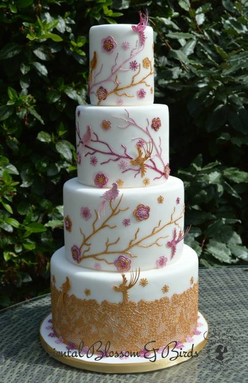 Cake Lace's Oriental Blossom & Birds has been designed to be versatile for a number of different occasions. The cake in the pictures uses a soft, romantic colour scheme but the branches can be inverted and made in gold Cake Lace to make thunder bolts, the birds made in black Cake Lace become ravens and make it perfect for Halloween and gothic designs! The birds can be used on their own to hold a banner and all elements are suitable for use on smaller cakes and cupcakes.