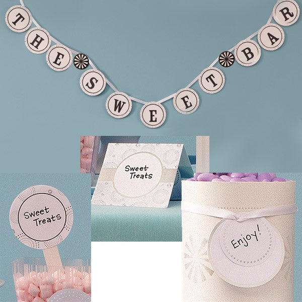 The Candy Décor Kit has all the extra components to make your candy buffet table the hit of the party. The adorable “The Sweet Bar” garland adds an extra special touch and brings attention to the candy display. Be sure to write a special note to your guests on the reversible tent cards, candy label sticks and swivel tags for the containers. (Black/White/Silver)