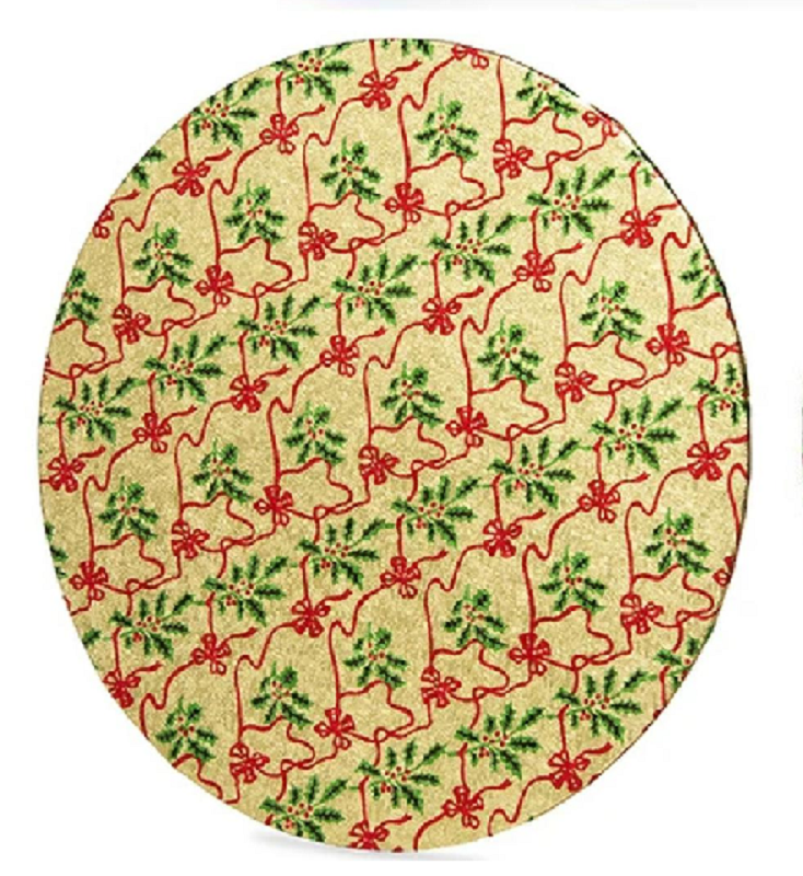 Make any food look elegant on this holly theme cake board. This round cake board features a cardboard base covered in foil with assorted holly prints. Finish is on one side only. Excellent to use to display all types of food.