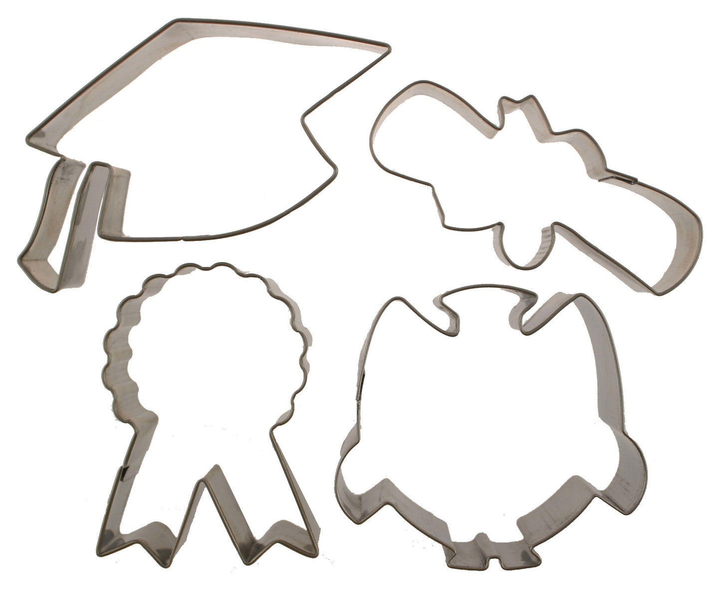 Make quick and adorable accents for cookies, cupcakes and cakes. Set contains four stainless steel cutters: graduation cap (3 3/8" x 2" or 86mm x 51mm), owl (2 7/8" 2 3/16" or 73mm x 56mm), ribbon (1 3/4" x 2 7/8" or 44mm x 73mm) and diploma (2 11/16" x 1 1/4" or 68mm x 32mm).
