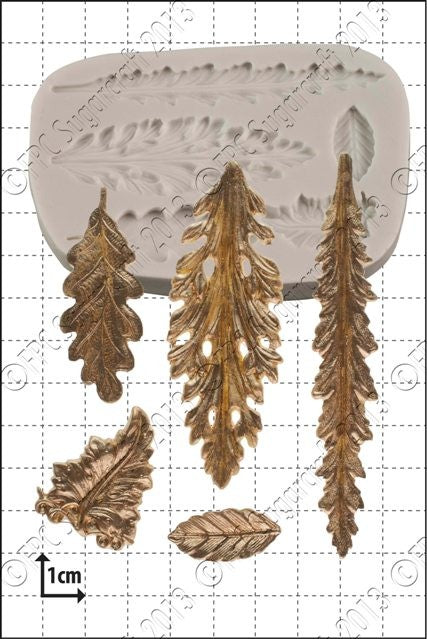 This silicone mould in the form of Decorative Leaves is suited for moulding sugarpaste decorations. Other foodstuffs and other modelling materials may be employed in these moulds. However we do not have direct experience of the use of the wide variety of materials that may be used.
