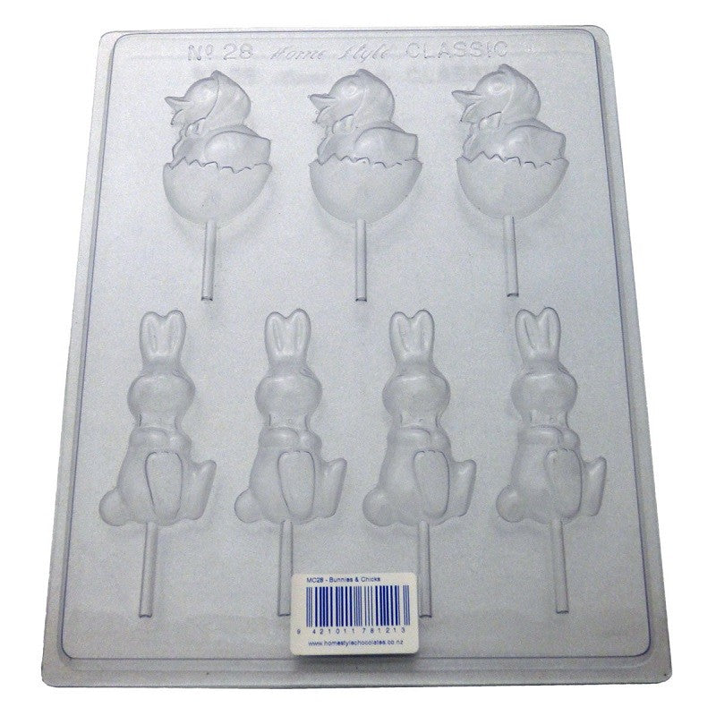 The bunnies and chicks chocolate mould has great Easter shapes that can go onto sticks to make chocolate lollipops.