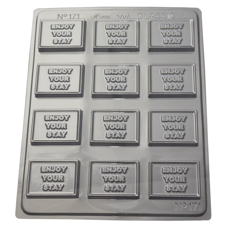 Appreciation phrase "ENJOY YOUR STAY" plaque chocolate mould, 12 individual cavities you can see in photo.
