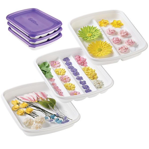Our three unique flower storage trays are specially designed for forming, storing and transporting royal icing, gum paste and fondant decorations.