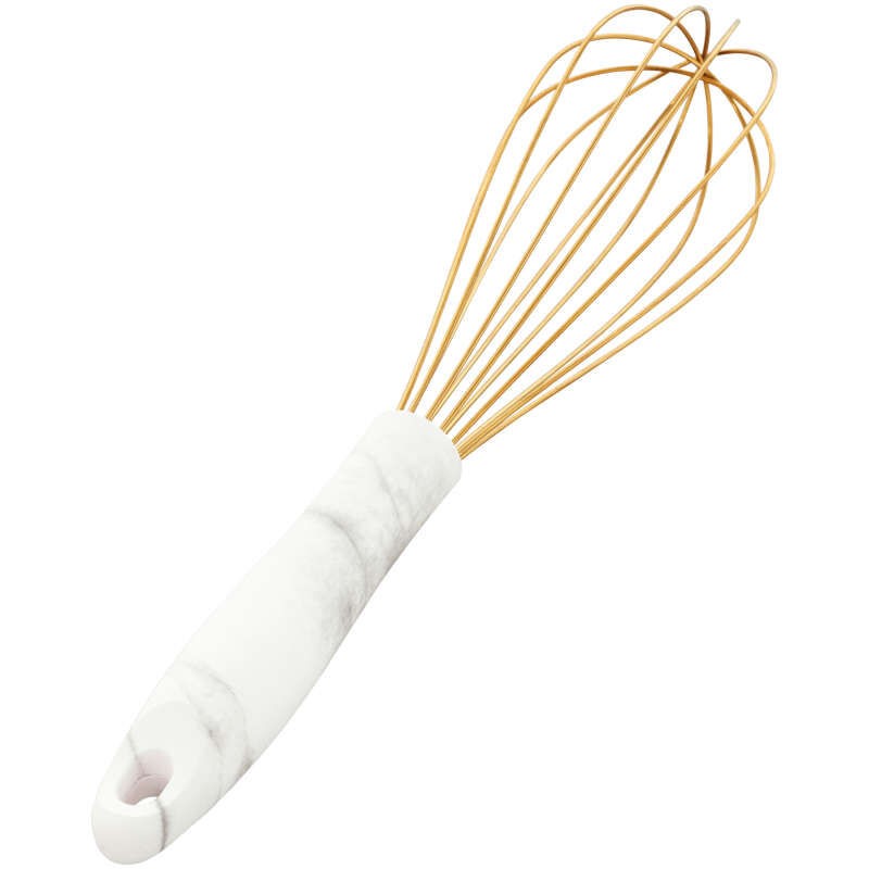 The kitchen is the heart of your home. Not only should it be functional, but it should also reflect your personality. Sleek and stylish, this Wilton large gold balloon whisk with a marble handle is a great addition to your cooking and baking collection. It's perfect for whipping eggs or batter but can also be used to mix dry ingredients or whipped cream. The handle features a marble print, which is sure to look great in almost any kitchen. It's ergonomically designed to fit comfortably in your hand and the hole at the base of the whisk makes it easy to hang. A favourite with beginning bakers and decorators, this whisk also makes a great gift for newlyweds or new homebuyers.
