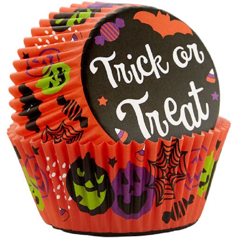 Cupcake liners feature Trick or Treat message and fun Halloween icons