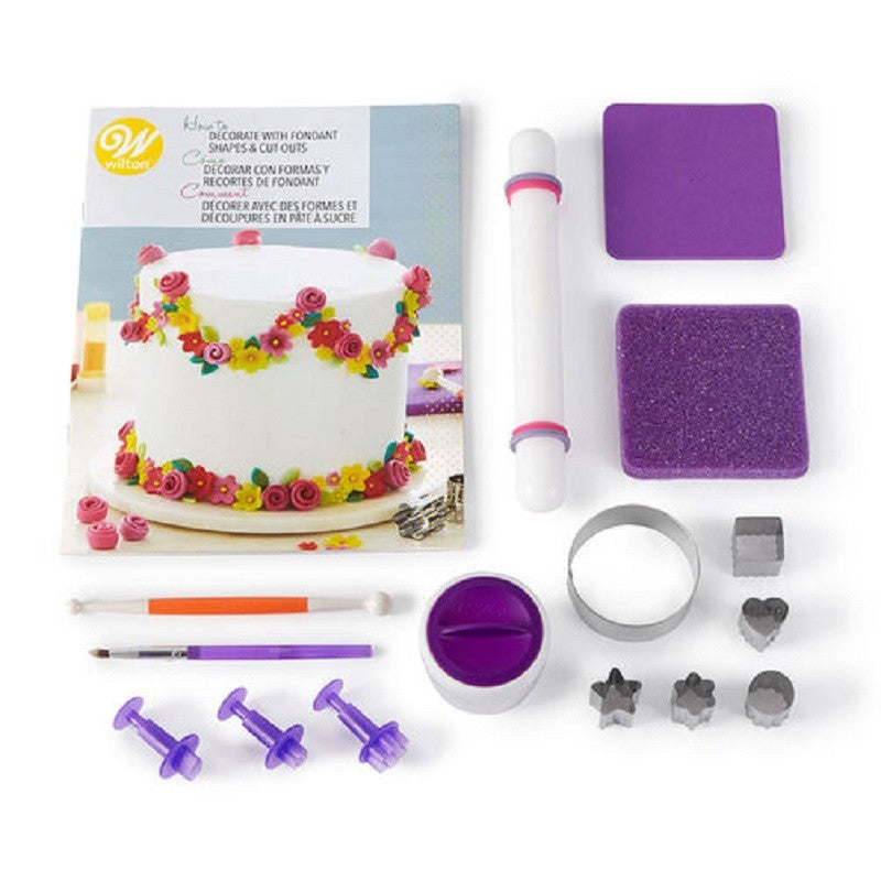 Includes: Decorating brush, 9-inch fondant roller with guide rings, dusting pouch, 6 shaped cutters, 3 mini fondant cut-outs, shaping foam set and ball tool
