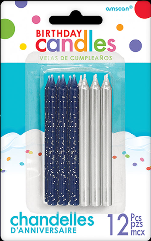 METALLIC SILVER and dark navy BLUE glitter candles pack of 12