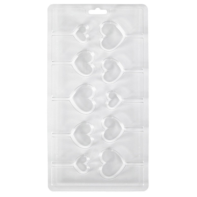 Using this Wilton lollipop chocolate mould you can easily make mini heart lollipops and toppers. The mold has 10 cavities with provision for lollipop sticks in it.