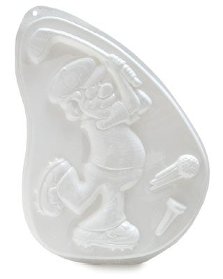 This revolutionary new style of plastic cake pan is a PANTASTIC pan. They can go in a regular oven to 375 degrees F, which is 190 degrees C (just place on top of an aluminium cookie sheet). They are reusable. You can also use them as a giant chocolate mould or jelly mould. Another tip is ...... you can mould certain features of the cake in chocolate and once the cake is baked, add the chosen features you have moulded in chocolate right on top of the cake - this cuts down on icing time and also adds a nice contrast in places. This Golfer measures 38cm x 27cm and comes with an instruction leaflet.