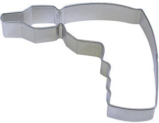 Power Drill cookie cutter, made of sturdy tin, Size 5" wide, 3" tall from the bottom of the hand grip to the top of the drill body. Depth 7/8 in