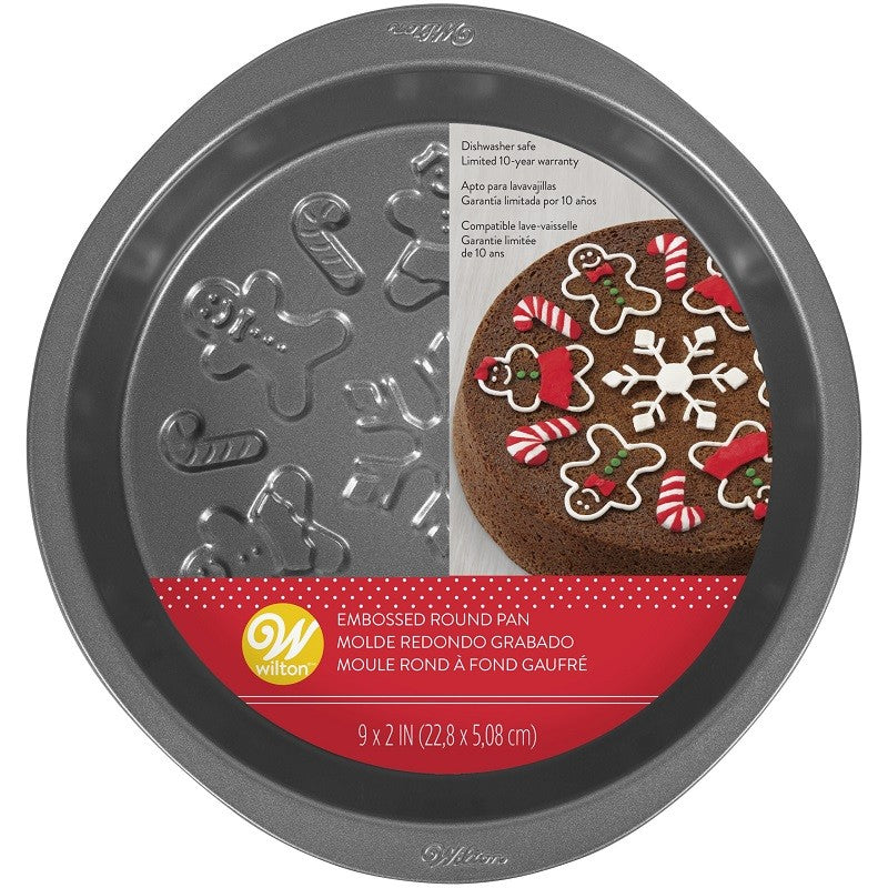 This round cake pan is embossed with Christmas shapes that make it super easy to bake and decorate a fun and festive dessert for the holidays! Bake your favorite cake mix or recipe and the embossing on the bottom of the pan will create outlines of gingerbread men and candy canes with a snowflake in the middle. Then decorating is easy – just pipe along the shapes with icing tinted in your favorite holiday colours! This pan is dishwasher safe for quick and easy cleanup.