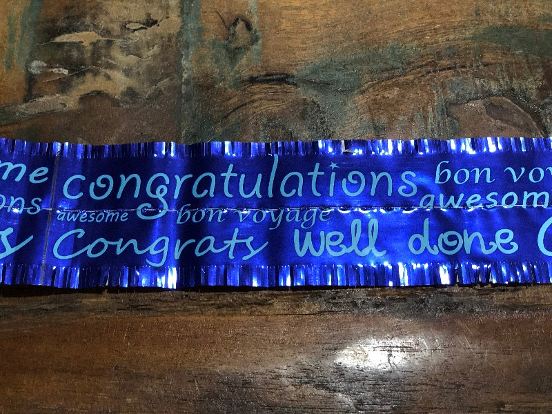 Congratulations, Well Done and bon voyage messages are on this cake frill. 1m length