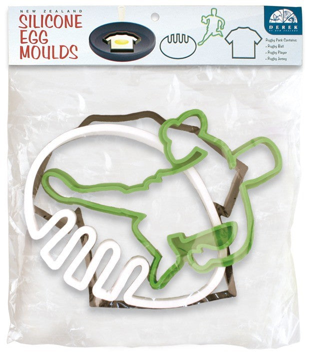 RUGBY SILICONE EGG MOULDS. The Egg moulds are fun for both adults and kids. The moulds can be used not just for eggs but also pancakes, cookies or even fritters. Made of Silicone which is low taint and non-toxic material. Extremely flexible so they can withstand extreme heat and cold temperatures. They are safe to use in ovens, microwave ovens, dishwasher & freezer. They are non-stick. Set consists of Rugby player, Rugby Jersey and Rugby ball.