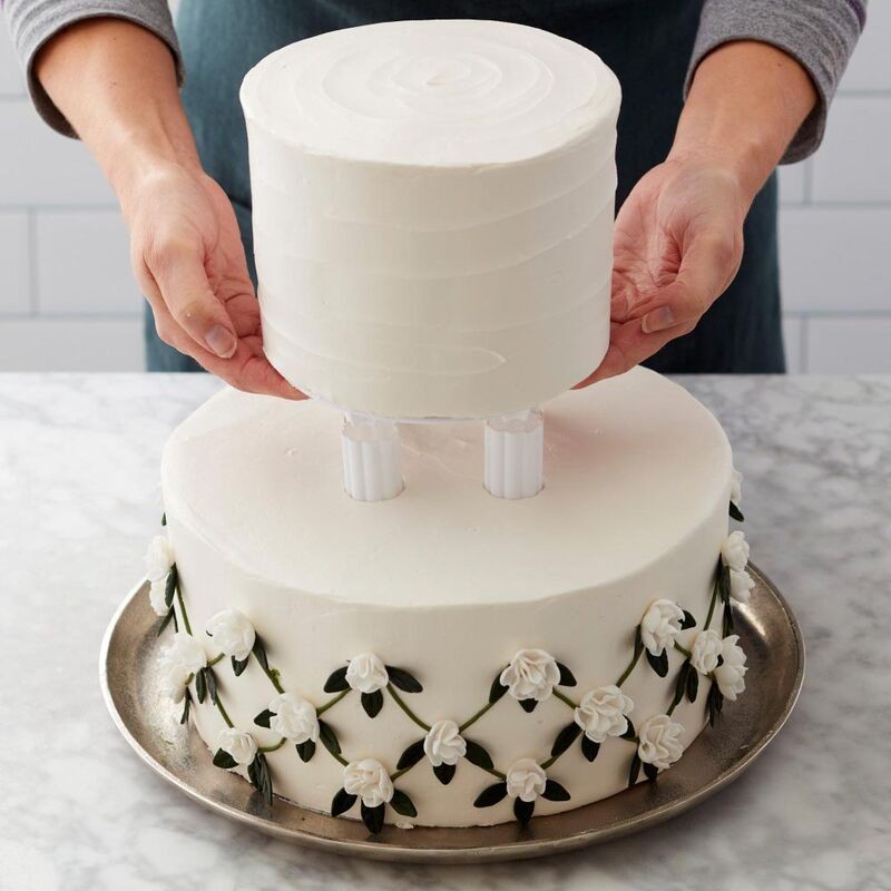 Photo 3 shows separator plates in place with hidden pillars (sold separately). Other Wilton Brand pillars will also look on to the feet of the plates.