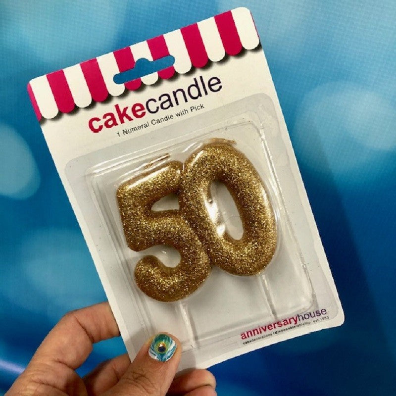 Special Age number candle gold glitter. With two picks, to press down in to cake, so number can stand straight on top of cake.