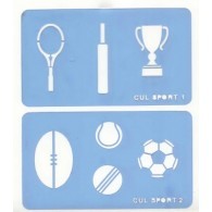 JEM sports stencil set. Set includes: Tennis racket, tennis ball, cricket ball, cricket bat, rugby ball, football and trophy. Can be dusted with edible lustre dust, spread with royal icing or used as a template to cut out paste.