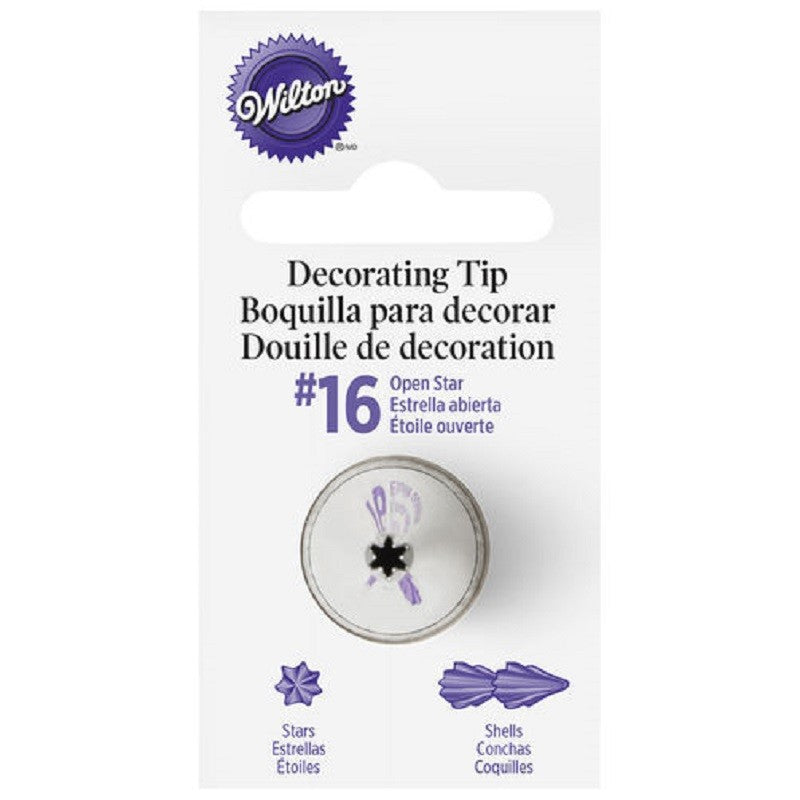 No. 16 Open Star Decorating Tip Star techniques and drop flowers; the finely cut teeth create decorations with many ridges. Photograph "Copyright 2004 Wilton Industries, Inc.".