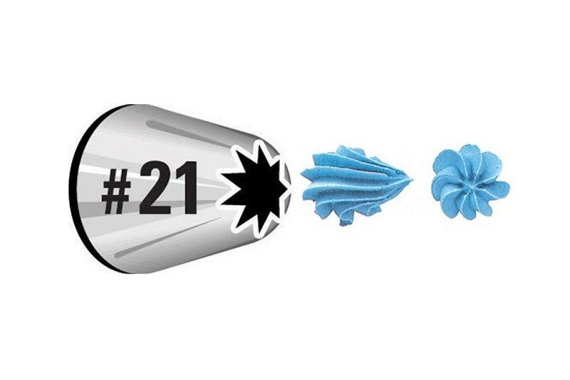 No. 21 Open Star Decorating Tip Star techniques and drop flowers; the finely cut teeth create decorations with many ridges. Photograph "Copyright 2004 Wilton Industries, Inc.".