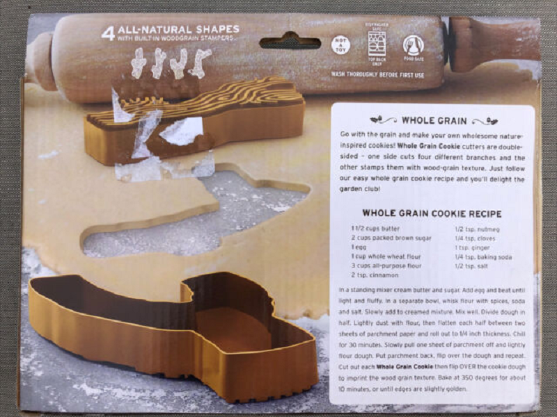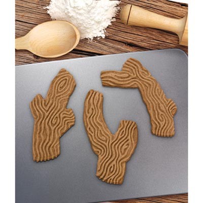 Double-sided cookie cutters – one side cuts the branches, the other stamps them with wood-grain texture. 4 durable plastic cookie cutter/stamps, packed on a reusable storage tray. Food-safe, hand wash only. Whole grain cookie recipe included!